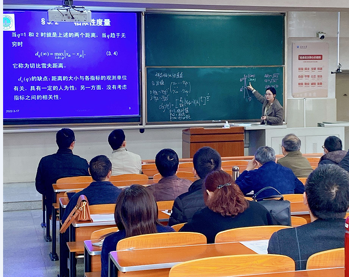 汪春花老师讲授了《高等代数》中“矩阵的乘法”,从向量的乘法引入,循序渐进地对矩阵的乘法及其满足的运算法则进行了讲解;魏永昌老师以大家感兴趣的案例引入间断点的定义,深入浅出地介绍了函数中几种不同类型的间断点;周全老师讲授了《多元统计分析》中聚类分析章节的“相似性度量”,通过对已学知识的回顾,引入相似性度量在聚类分析中的重要作用,并通过实例对样品间及指标间的相似性度量方法进行了介绍。