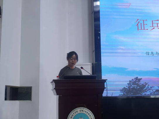 本次宣讲会由入伍学生黄晓君进行讲解。她通过亲身经历为同学们讲述了参军入伍所带来的收获和成长。军旅生涯不仅练就了她过硬的本领和健康的体魄,更淬炼了她广阔的胸襟、顽强的意志和坚毅的精神,并收获了浓厚的战友情。同时,她也做了相关政策的讲解,她详细介绍了大学生参军入伍的相关政策和待遇,国家为鼓励大学生参军入伍,制定了一系列优惠政策,包括学费减免、就业保障、优先升学等,这些政策为大学生参军入伍提供了更多的保障和动力。她呼吁同学们踏上这充满荣光的征程,加入军营这个无比光荣的集体,并预祝有意加入军营的同学们能够实现人生理想。