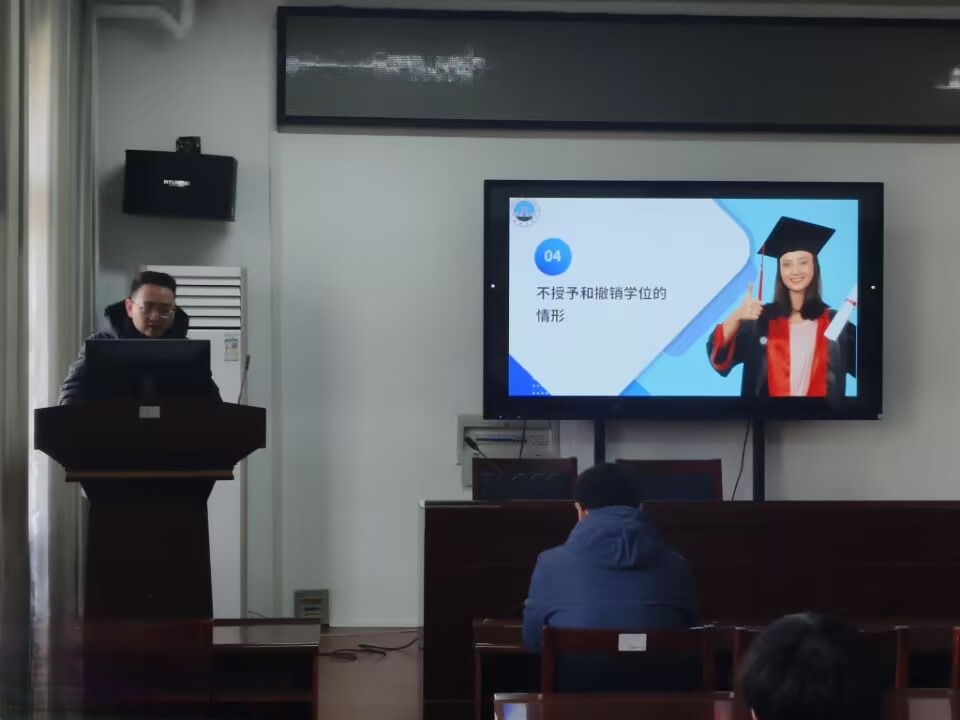 为确保学习效果,各班级还以主题班会的形式,由辅导员带领学生研读《学位法》条文。辅导员们结合实际案例,深入浅出地讲解《学位法》中关于学位授予条件、程序、撤销等核心内容,引导学生思考《学位法》对自身学业和未来发展的影响。同时,学院利用线上平台发布《学位法》学习资料和条款解读PPT,方便学生随时随地进行学习和交流。
