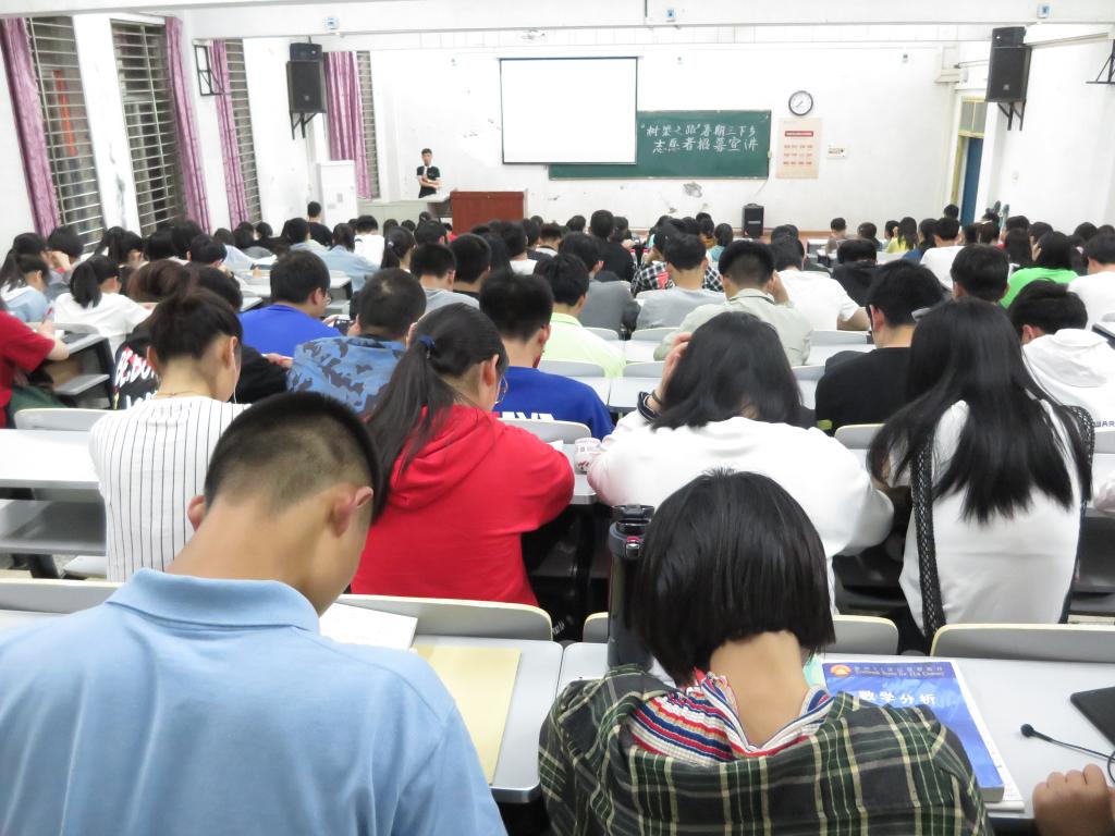 (通讯员 汪志东) 青春烛梦,爱满校园。为进一步引导和帮助我院青年学生深入社会、了解国情,在勇于实践中践行社会主义核心价值观,以奉献青春服务人民的实际行动勇担新时代重任,5月21日晚7时,我院“树梁之路”暑期三下乡志愿者招募宣讲会在西校区5教203教室隆重举行,宣讲会由优秀志愿者代表朱佐民、卢宇、杨雪主讲,我院辅导员钟赛老师和2018级全体本科生参加宣讲会。