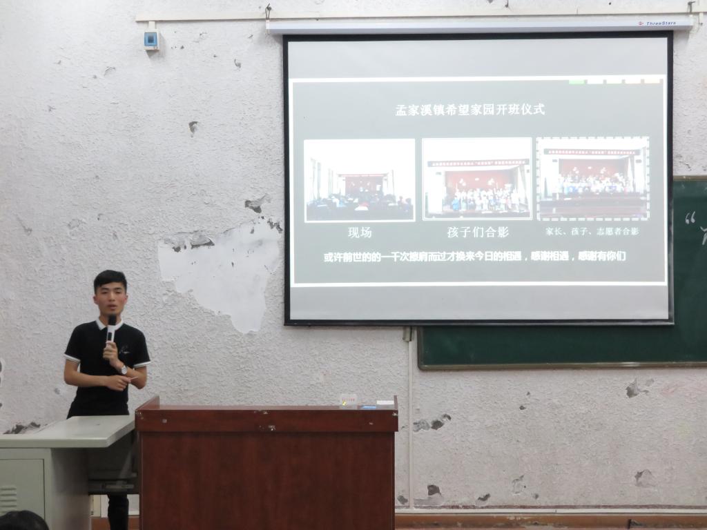 宣讲会上,三位志愿者分别对暑期三下乡社会实践活动的认识和理解、过去在志愿服务中的收获与体会以及如何发扬“奉献、友爱、互助、进步”志愿精神等方面展开论述。一场场与乡村朴实孩童们的真诚邂逅,一段段满怀柔情、无微不至的热情服务,一幕幕充满酸甜苦辣、令人刻骨铭心的志愿经历……一切仿佛就发生在昨天,志愿者们用他们的亲身经历引得教室同学们掌声阵阵,现场气氛温暖感人。最终,辅导员钟赛老师总结道,大学期间所有同学要珍惜学校提供的每次社会实践机会,以自己的实际行动在实践中健康成长,于服务中磨砺贡献,在选择中得到锻炼,培养不怕吃苦,乐于奉献的高贵品质。