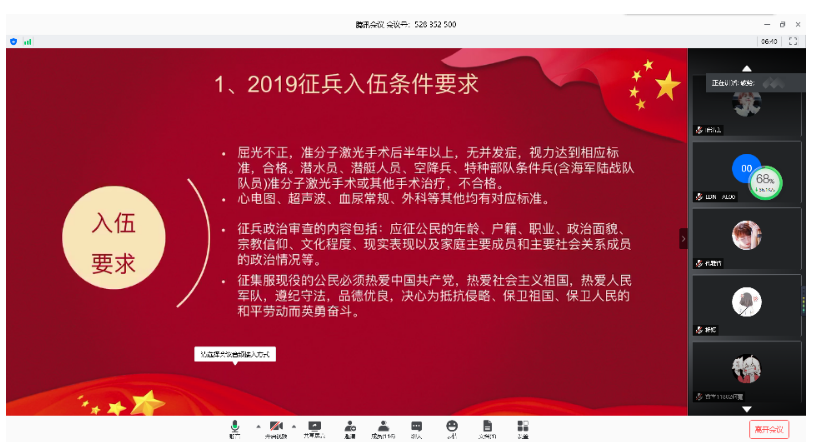 (通讯员 黎璐)为鼓励学生积极参与应征入伍,提高兵员征集质量,推进国防和军队现代化建设,我院于5月15日晚七时举行了“2020年征兵宣讲线上会议”,特邀韩王戴贤和邓书雨两位退伍军人为与会成员进行宣讲。我院征兵专干严星老师、各班班干及有参军意向的全体同学参与本次会议,会议由周锦主持。