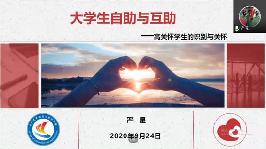 严老师主要从高关怀学生类型、心理危机的识别、学生骨干如何干预、我校心理健康中心这四方面展开。