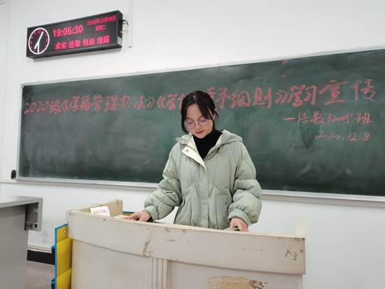 (通讯员 聂琴琴)为了帮助2020级新生全面理解《学籍管理办法》、《学位授予细则》等相关内容,制定明确的学习目标,提高在校期间的学习效率,我院于12月8日晚19时在7教308室开展了学习宣传活动。此次活动由信数32005班团支书陈艾思主讲,信数32005班全体同学参与。