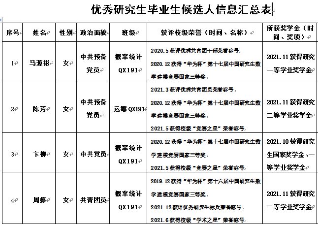 根据学校《关于开展2022届优秀研究生毕业生评选工作的通知》要求,我院认真组织开展了2022届优秀研究生毕业生评选工作,经个人申请、班级推荐、学院审议,讨论决定拟向学校推荐优秀研究生毕业生4名,现予以公示。