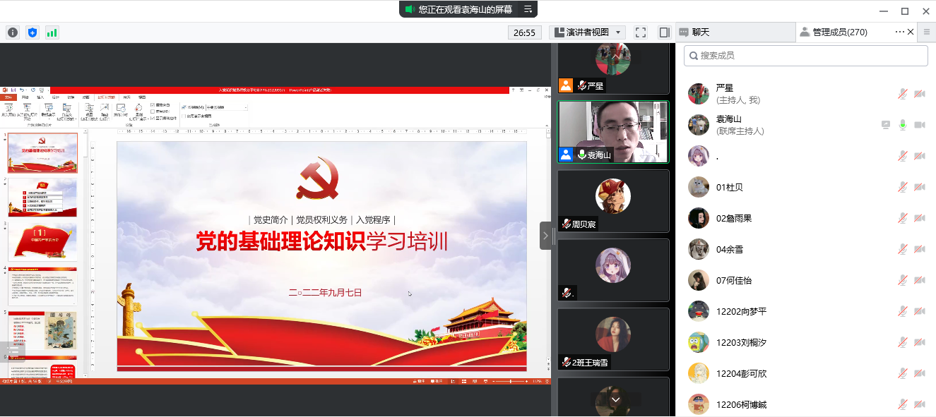 (通讯员 慈永鑫)9月7日下午两点半,yl6809永利集团22级全体本科、研究生新生在腾讯会议上了一堂生动的党课。本次课程由学院党委副书记袁海山主讲。