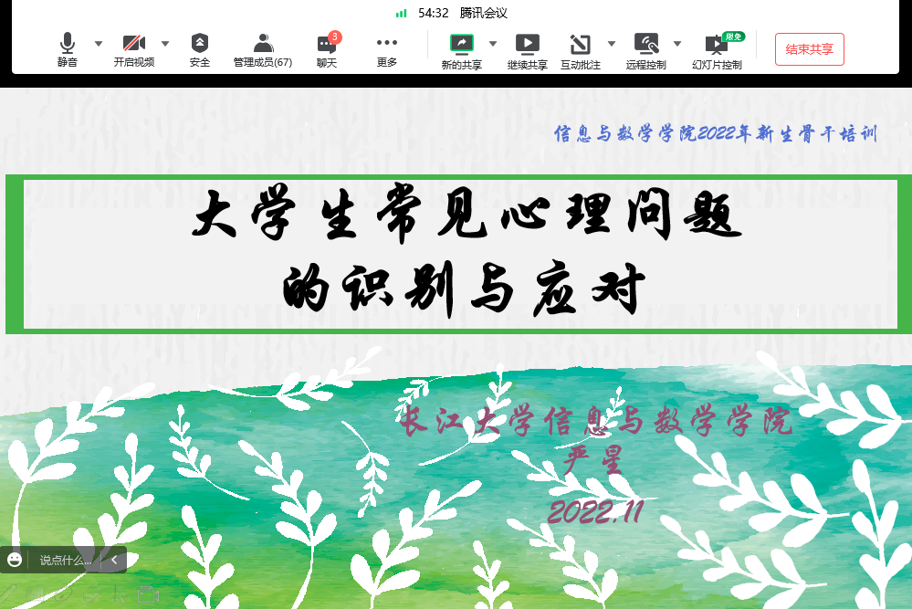 严老师从何为心理健康、识别心理问题、学习心理援助、熟悉心理体系四个方面为新生班干们进行了培训。