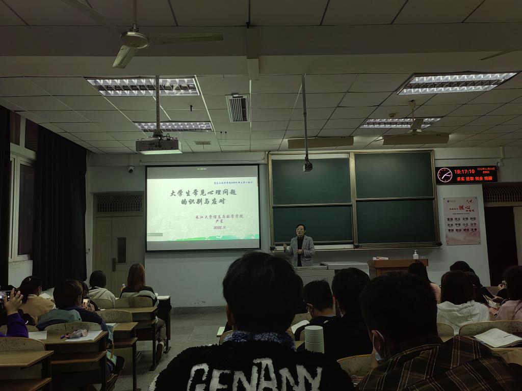 接着,严老师讲到如果在适应阶段出现问题,会产生一系列的不良反应,当身边同学出现心理问题时,我们该如何去识别,并为大家介绍了大学生最易发的抑郁症、焦虑症、躁狂及精神分裂的行为表现。