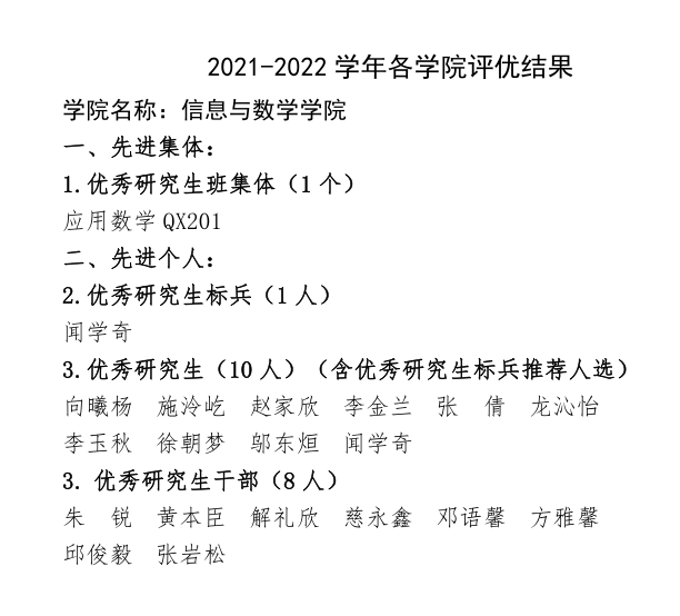 为了树立先进典型,充分发挥典型的教育示范作用,学校研工部决定,评比和表彰一批先进集体、先进个人。经过个人申报,民主评议,院学生事务办公室推荐,学院评审小组审核,现将2021-2022学年研究生工作先进集体和个人评选结果予以公示,具体名单详见附件。 公示时间为:2022年11月29日—12月1日。公示期间,凡对上述评选有意见者,请及时以书面或口头形式向分管学生工作的领导反映。 联系人:袁海山 联系电话:0716-8060378 yl6809永利集团学生事务办公室 2022年11月29日