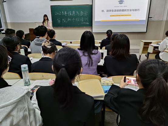 接着,辅导员黄何围绕“高校学生干部应当具备的素质和能力”展开对学生干部的培训。他强调了学生干部的重要性,提出学生干部是高校学生中的骨干和灵魂。学生干部的工作水准,个人素质的高低,直接影响着校园文化建设的质量和效果,也是直接影响学校各项工作能落到实处的重要因素,因此要加强学生干部的培养。而后,他从“政治素质”、“思想品质”、“能力素质”、“集体思想”四个方面讲述高校学生干部应当具备的素质和能力,指出作为学生干部应当有正确的政治思想,良好的道德品质,为同学们做好带头作用,要努力提升自己的政治理论水平,积极向党组织靠拢,要有强烈正义感和责任心。