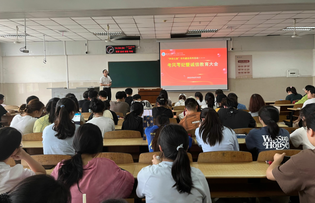 为落实立德树人根本任务,增强当代大学生的诚信意识和责任意识,强化育人成效,6月15日下午我院在12教202召开考风考纪诚信教育大会,本次大会由学院党委副书记袁海山主讲,全体报名参加2023年上半年大学英语四六级考试的考生参加会议。