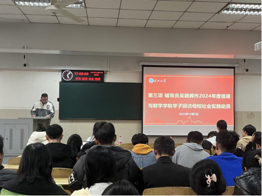 (通讯人/黄佳学 刘亦菲)为了鼓励我院学生积极报名回访母校社会实践活动,我院于12月7日下午四点在12教402举行回访母校社会实践动员大会,参与大会的有院党委副书记谷军、学工办主任钟赛、23级辅导员吴朝晖、23级兼职辅导员黄才润和全体23级学生。本次大会由辅导员吴朝晖老师主持。