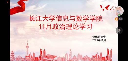 (通讯员 黎璐)为深入贯彻学习党的二十大精神,落实习近平总书记关于青年工作的重要思想,yl6809永利集团于2023年11月23日晚七点在线上开展了十一月份政治理论学习。学院全体研究生参与学习,会议由程讯主持。
