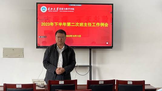 (通讯员 陈京玲)为加强班主任队伍的建设,提高班级的管理水平,了解近一阶段的工作,我院于10月13日在8教406召开2023年下半年第二次班主任工作例会。院党委书记李喜成、院党委副书记谷军,院学工办主任钟赛,院团委书记黄何、辅导员吴朝晖以及全体班主任参与此次例会。
