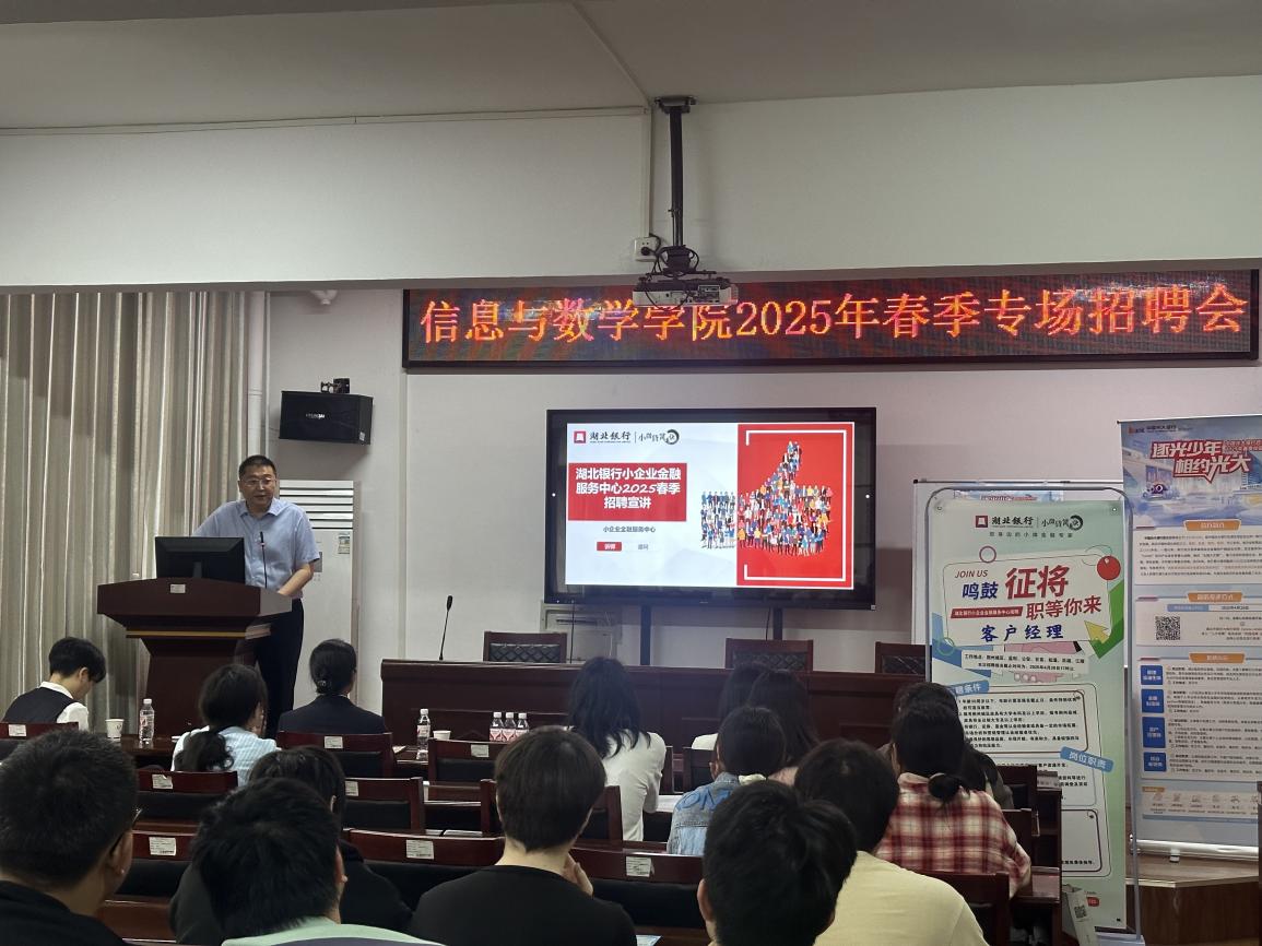 (通讯员 于志浩)4月11日下午,我院在8教406会议室举办春季专场招聘会,搭建供需桥梁,推送人才与企业精准对接,吸引了大量应届毕业生踊跃参加。此次参加招聘的单位有工商银行、光大银行、湖北银行、沙市七中、沙市一中、公安博雅中学、安良百货有限公司、瑞丁文化传播有限公司、荆州市华川计算机科技有限公司等。