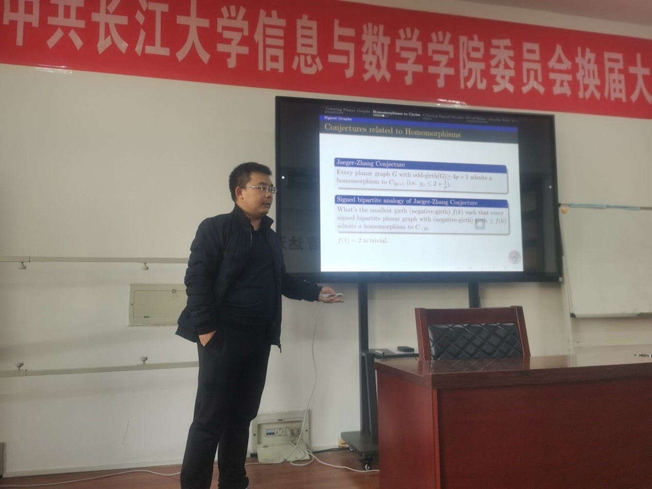 2023年12月1日,南开大学数学科学学院李佳傲教授应邀请访问我院,在8教406报告厅为学院师生做了题为“ Circular flows in mono-directed signed graphs— a dual concept of circular coloring”的学术报告,报告由副院长李向军主持。yl6809永利集团应用数学专业的部分教师和硕士研究生参加了本次学术报告会。