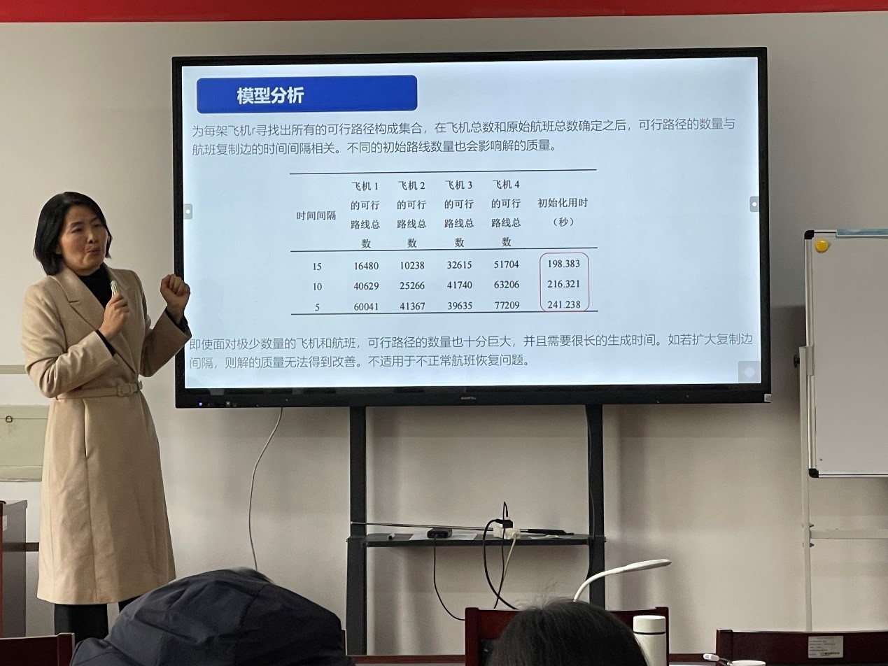 学术团队成员唐与聪副教授也向师生们介绍了飞机改航问题的模型与算法。首先在考虑机位资源,机场容量和维护灵活性的约束下建立了飞机改航模型,然后通过增广拉格朗日方法放宽一些硬约束,在交替方向乘子法框架下将大规模问题分解为多个子问题,最后使用列生成法来求解子问题。