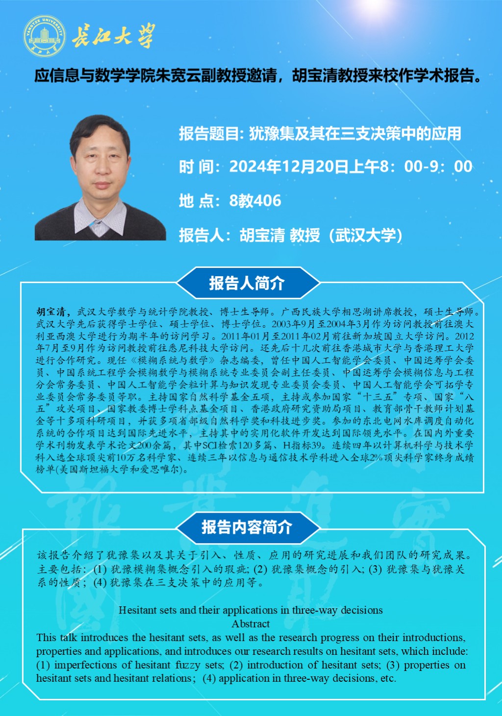 报告人 胡宝清 教授(武汉大学) 报告时间 2024年12月20日上午8:00-9:00