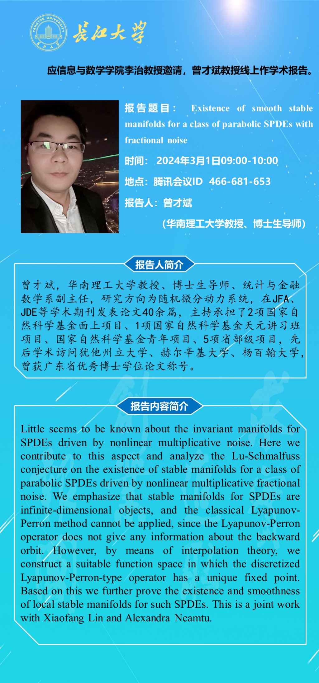 报告人 曾才斌(华南理工大学教授、博士生导师) 报告时间 2024年3月1日9:00-10:00