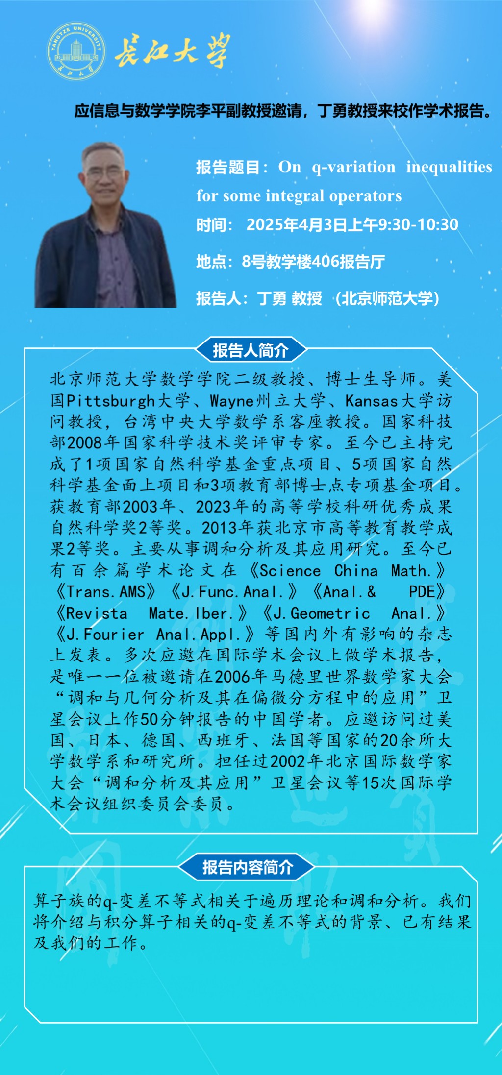 报告人 丁勇 教授 (北京师范大学) 报告时间 2025年4月3日上午9:30-10:30